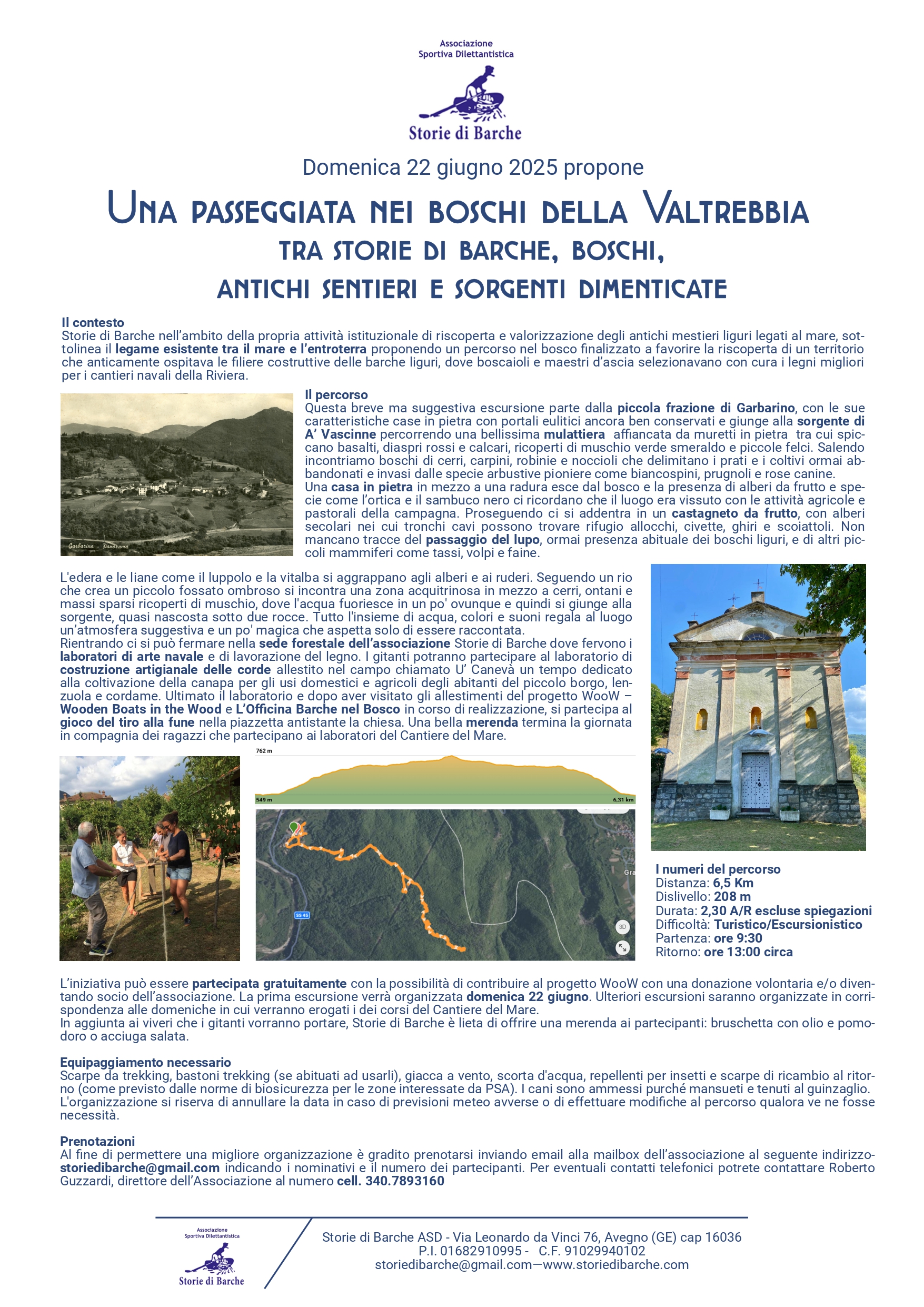 Una passeggiata nei boschi della Valtrebbia tra storie di barche, boschi, antichi sentieri e sorgenti dimenticate, alla riscoperta di un territorio che anticamente ospitava le filiere costruttive delle barche liguri, dove boscaioli e maestri d’ascia selezionavano con cura i legni migliori per i cantieri navali della Riviera.